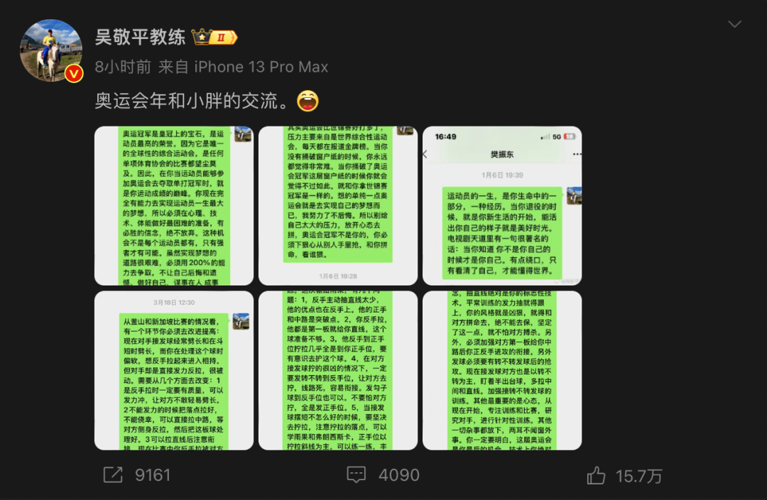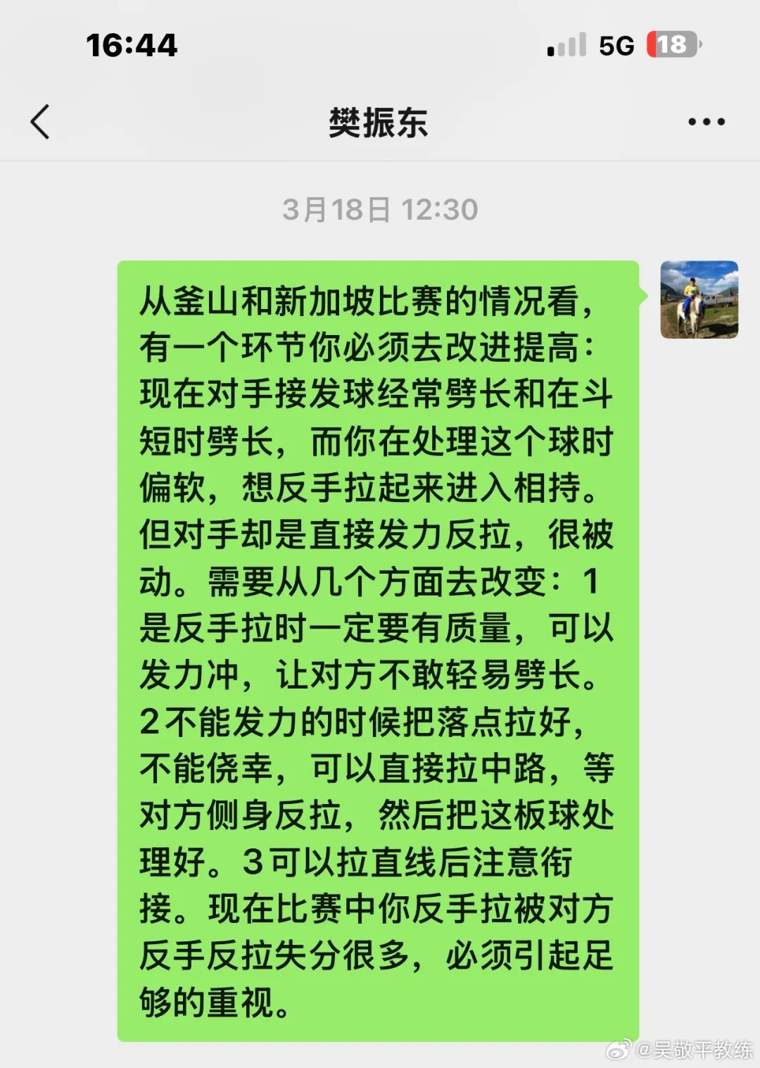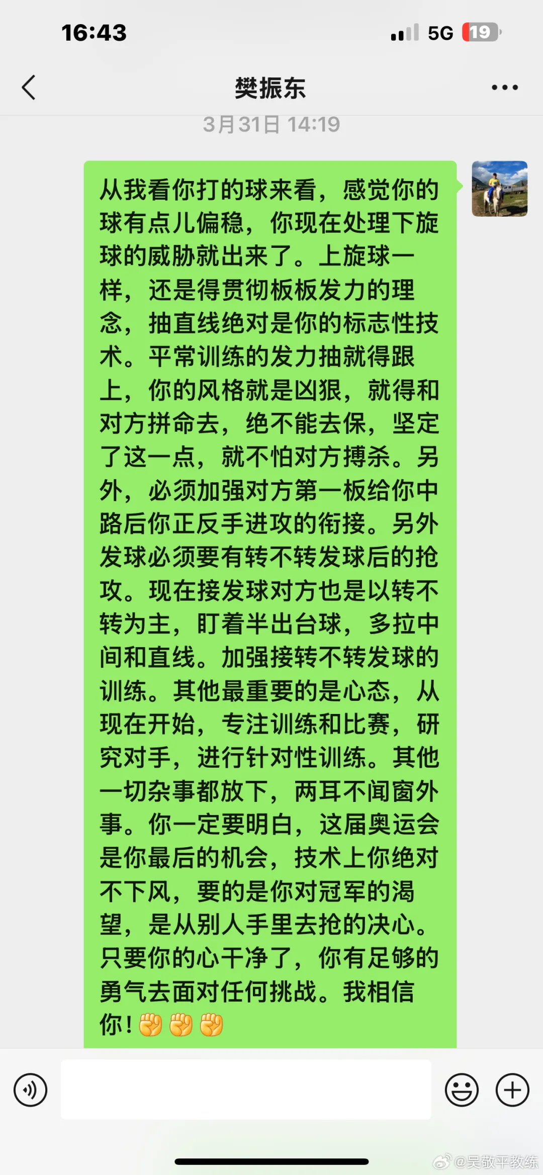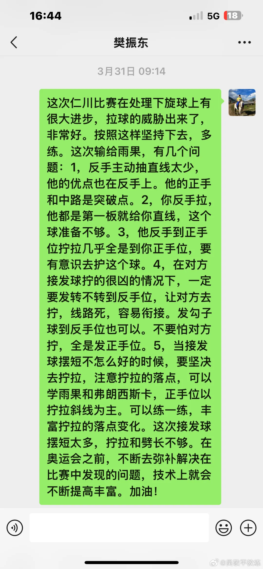聊天记录中,吴敬平教练无时无刻不在关注着樊振东的比赛,从心理建设到技术提升都给予相应的建议和指导。