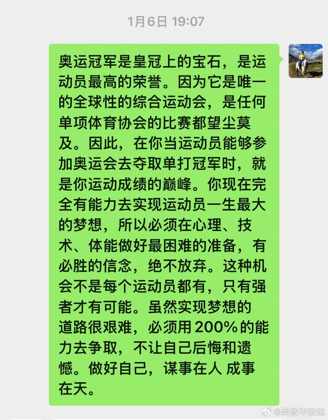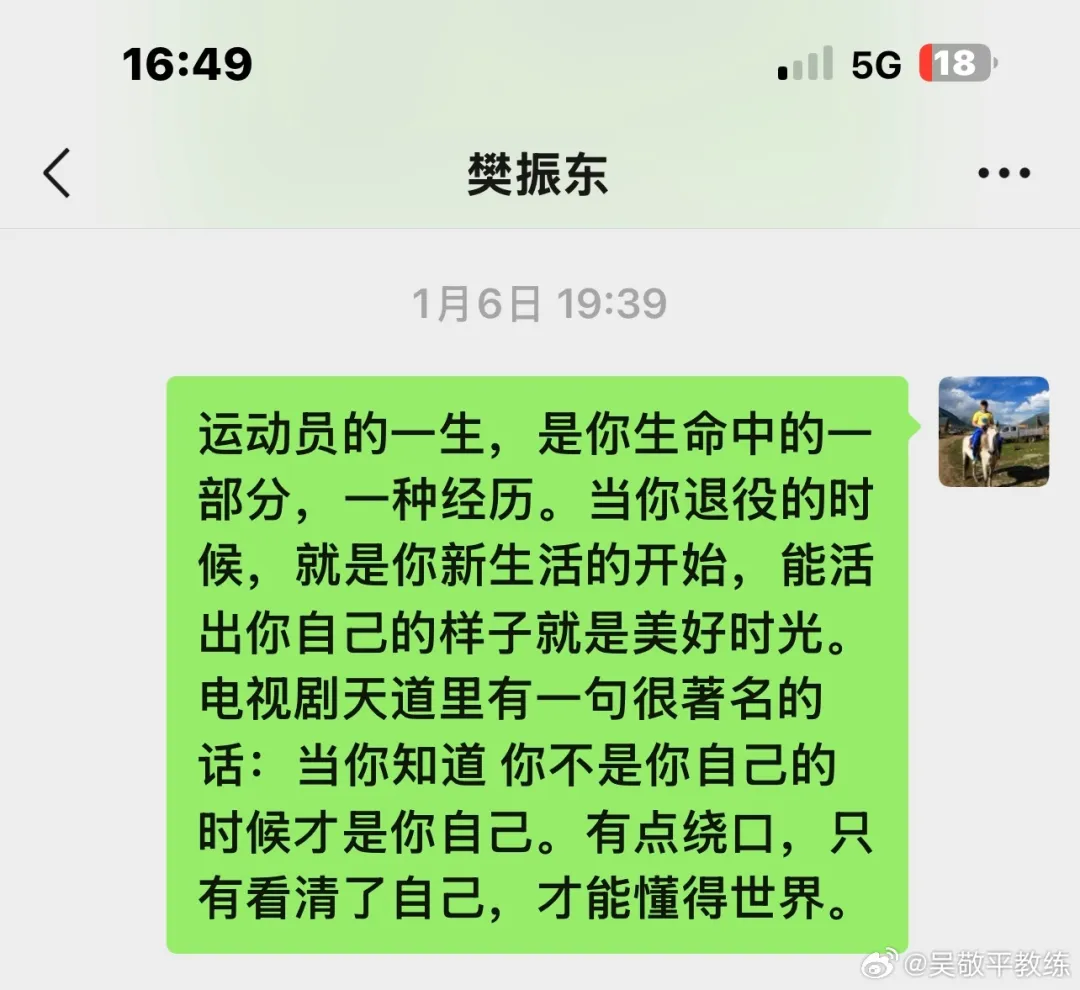 1月4日,中国乒乓球队男子队前教练吴敬平在社媒晒出了2024年他与樊振东之间的交流。