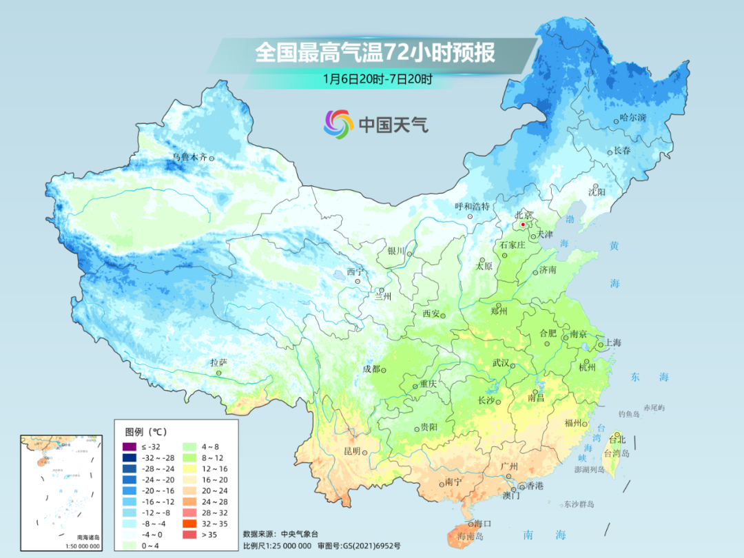 全国天气方面,今日小寒,但开局却显得较为温暖。预计今天华北南部到西南地区东部将出现大范围升温,黄淮南部到江南等地最高气温普遍在15℃左右,华南大部地区超过20℃。