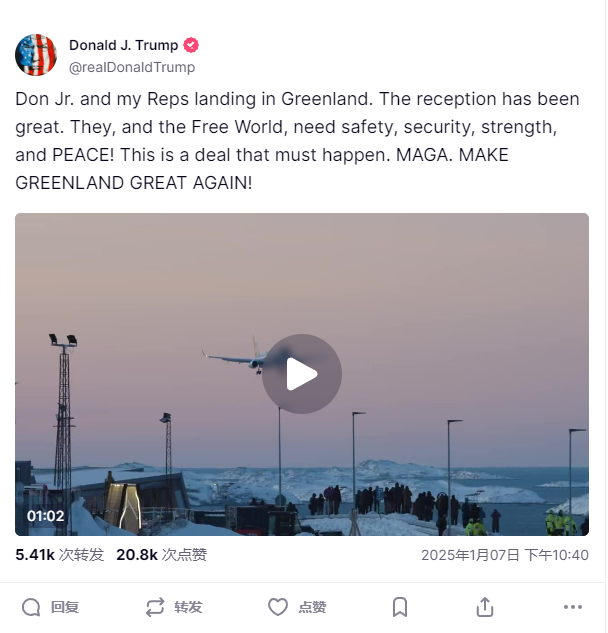 “小唐纳德和我的代表们抵达格陵兰岛。受到非常热情的接待。”在随后的推文中,特朗普也兴奋地写道,“格陵兰岛和自由世界需要安全、保障、力量以及和平!购买格陵兰岛是一项必须达成的协议!这是一项必须达成的协议。让格陵兰再次伟大!”