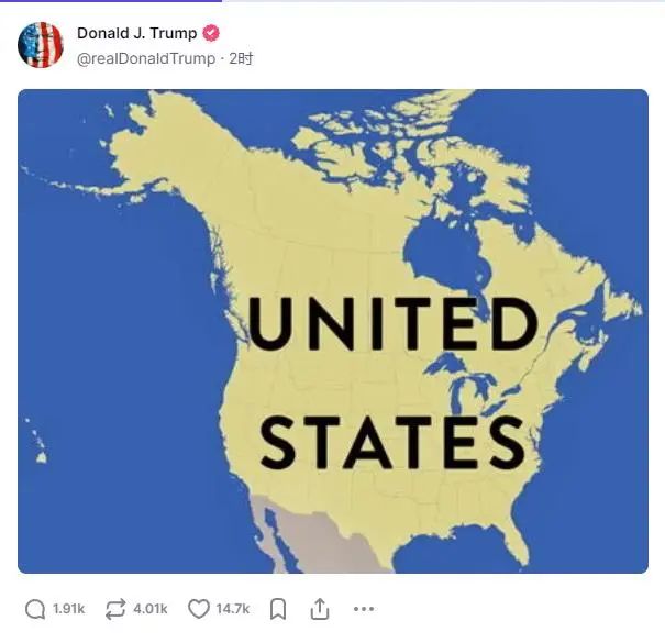 特朗普还在社交媒体上直接发布了一张“地图”,在这张图中,加拿大和美国被涂成相同的黄色,整片区域被标注为“美国”。