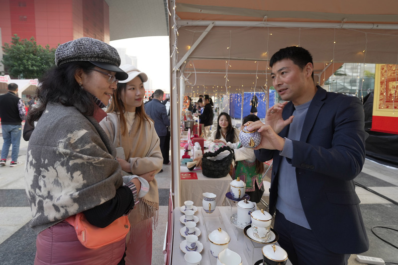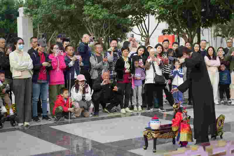 在非遗产品展示区,棉塑摊位吸引了众多目光,有憨态可掬的小动物、精美绝伦的花卉,还有生动传神的人物形象。皮影制作摊位上,一张张精美的皮影在灯光的映衬下,仿佛有了灵魂,生动的表演让市民们感受到了这一古老艺术形式的独特魅力。刚刚考完期末考试的赖同学从坪山赶到市区,叫上自己的同学一起品尝本次活动的美食、体验制作非遗作品。“我想买点非遗的产品回家,感觉挺好玩的,像钵仔糕、糍粑这些吃的,还有那些鱼皮浮雕画也特别有意思!”