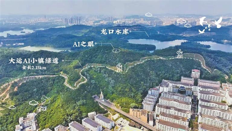 山下,原先的老旧工业园区摇身一变成为科技赋能、“未来范”十足的AI小镇;山上,一条绿道就好像从天空飘落的绸带一般,在山林间蜿蜒曲折,起点和终点正好接着小镇的两头,既像是小镇的一条披肩带,又像在不断给小镇提供支持、提供温暖的宽广怀抱。