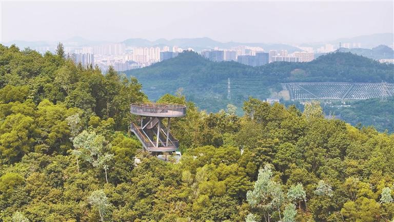 一路登上山顶,有一座由钢结构打造成的观景平台,名为“AI之眼”。在这里,沿着楼梯登上高台,一面是繁华的城区景象,另一面则是水源充沛、生态良好的龙口水库,一眼望遍城市与自然交融的风光。