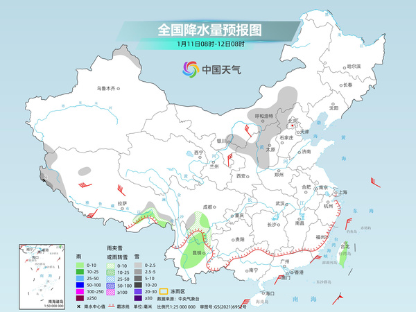 中央气象台预计,1月11日,新疆北疆北部、西藏西南部、宁夏北部、陕西北部、山西西部和北部、内蒙古中部、河北西北部、四川南部、云南东北部等地部分地区有小到中雪或雨夹雪。云南中部、台湾岛东部等地部分地区有小雨。