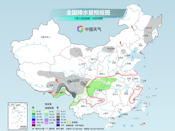 1月13日,西藏东部、青海南部、川西高原、云南西北部、黑龙江东部、吉林中东部等地部分地区有小到中雪或雨夹雪,其中,西藏东南部、云南西北部等地局地有大雪。四川盆地大部、陕西南部、湖北西部、西藏东南部等地部分地区有小雨,其中,西藏东南部等地部分地区有中雨。
