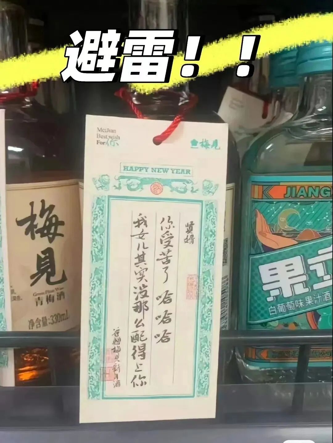 图片显示,在该新年包装上,其中一条文案写道“贤婿,你受苦了,哈哈哈,我女儿其实没那么配得上你。爸赠梅见新年酒。”