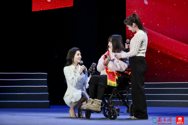 助人为乐“广东好人”蓝玉娜是梅州市梅江区向日葵助残服务中心理事长。2013年,一场车祸导致当时23岁的蓝玉娜颈椎五、六节完全性损伤,从此生活不能自理,全身几乎无法活动,只能与轮椅为伴。2015年,蓝玉娜为解决生存问题,凭借自幼对文学的热爱,开始接触公众号,成功将爱好转为职业。2018年,她拿出积蓄与朋友合办文化传媒公司。念及求职艰难的轮友,她先后聘用10位残疾人居家全职或兼职。2022年,她与轮友林力发起成立梅州市梅江区向日葵助残服务中心,助力残疾人生活、职业重建。“公众号后台有很多朋友给我留言,说都被我感动到了,我的存在能给大家带去对生活的信心,能够帮助到大家,这就是我生命的意义。”当晚,蓝玉娜在台上深情说道,“愿你在面对困难时有刚强的铠甲,温柔时可以笑靥如花。”