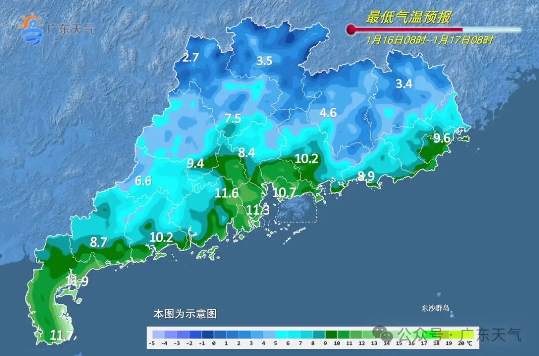 17日,全省晴间多云。最低气温:粤北偏北市县0~3℃,高海拔山区零下4~0℃,有冰霜冻,粤北其余市县和珠三角北部3~6℃,南部市县9~11℃,其余市县6~9℃。