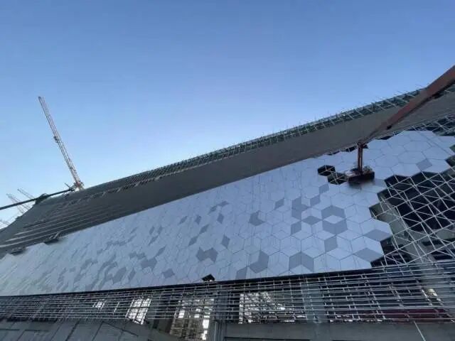 据现场中建三局的工作人员介绍,目前主体结构全面封顶,已进入装饰装修阶段。此外,酒店和配套商业部分与雪场钢结构同期封顶,机电、幕墙、精装也同步穿插施工,其中外墙现在进入了幕墙安装阶段。