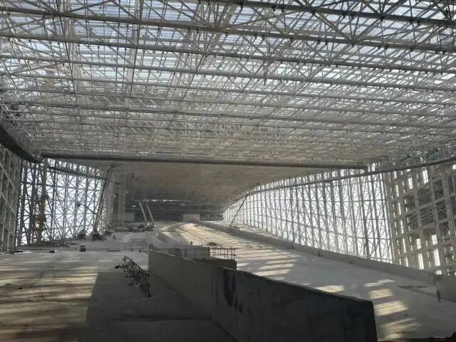 据悉,冰雪世界项目钢结构共有4.2万吨,用钢量达到北京“鸟巢”级别。项目主体的高区通过8根巨型格构钢柱作为支柱,撑起上部跨度120米、重达3.5万吨的桁架体系。这种大跨度超大空间桁架体系的设计,既满足了雪场内部充裕的功能空间需求,同时也保证了项目结构的安全稳定。