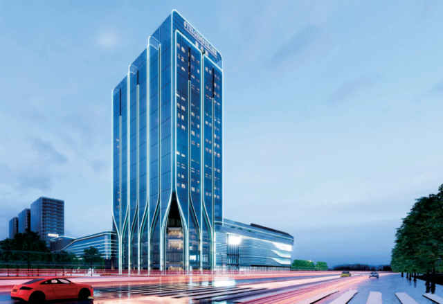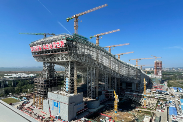 冰雪世界项目内的华发超雪中心整体建筑面积约10万平方米,建筑高度约106米。从外部看,超雪中心的外部已经呈现出“蓝鲸跃海”的完整结构,如流线优美的蓝鲸从深海跃起。