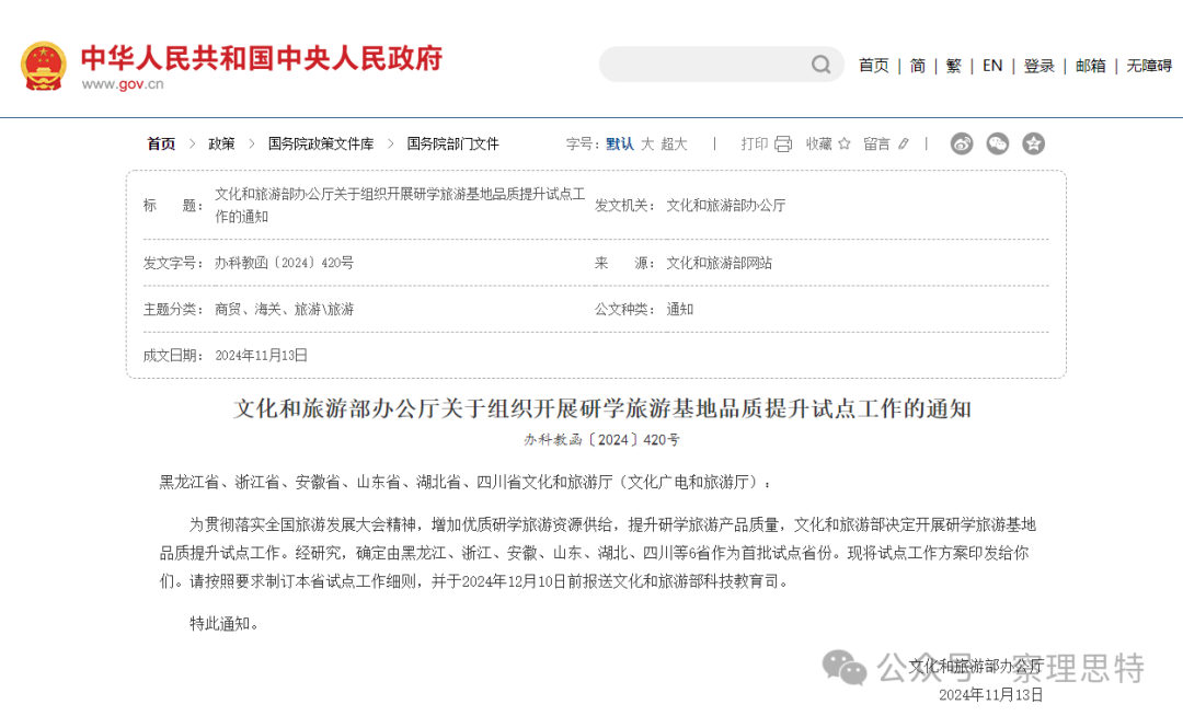 此前,为增加优质研学旅游资源供给,提升研学旅游产品质量,文化和旅游部办公厅发布了《关于组织开展研学旅游基地品质提升试点工作的通知》,确定黑龙江、浙江、安徽、山东、湖北、四川6省为研学旅游基地品质提升首批试点省份,旨在逐步培育形成一批在成长轨迹上可跟踪、在发展程度上可检验、在建设经验上可推广的,特色突出、管理有力、口碑过硬的品牌研学旅游基地。