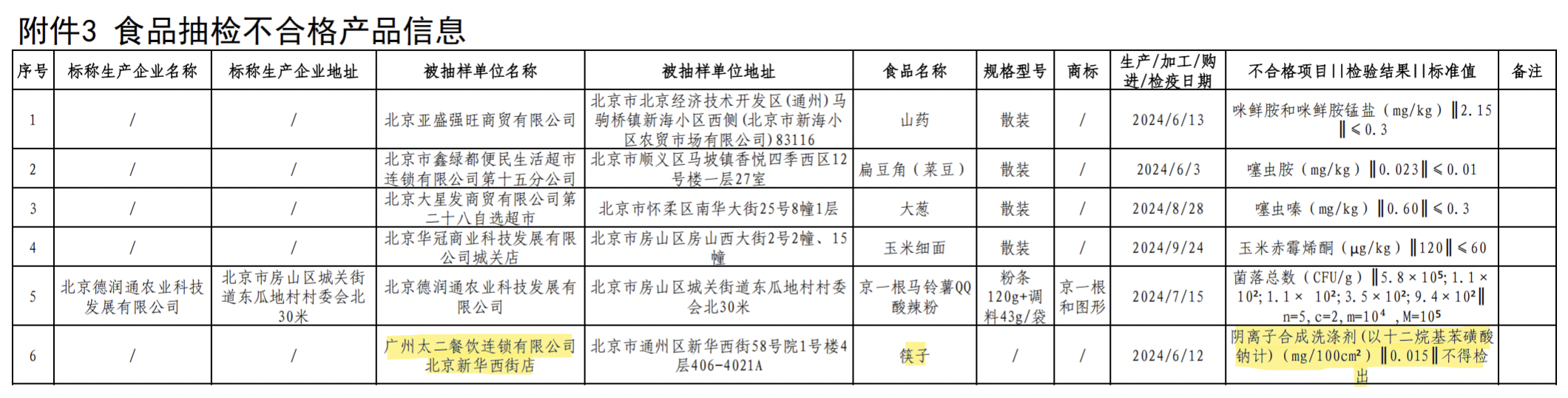 据北京市场监管局披露,广州太二餐饮连锁有限公司北京新华西街店位列抽检不合格的名单,原因是在该店的筷子上检测出了阴离子合成洗涤剂(以十二烷基苯磺酸钠计)。
