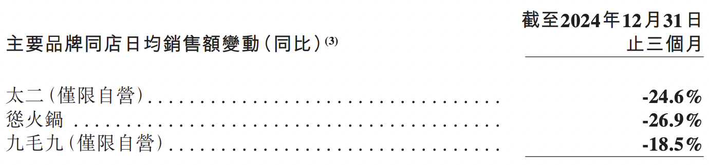 事实上,不止第四季度,九毛九2024年旗下3个主要品牌的同店日均销售额持续下滑,第二季度、第三季度均同比下降超过10%,其中怂火锅的降幅更是超过3成。