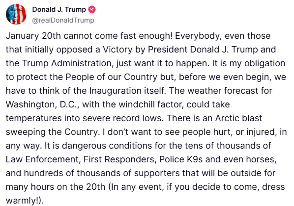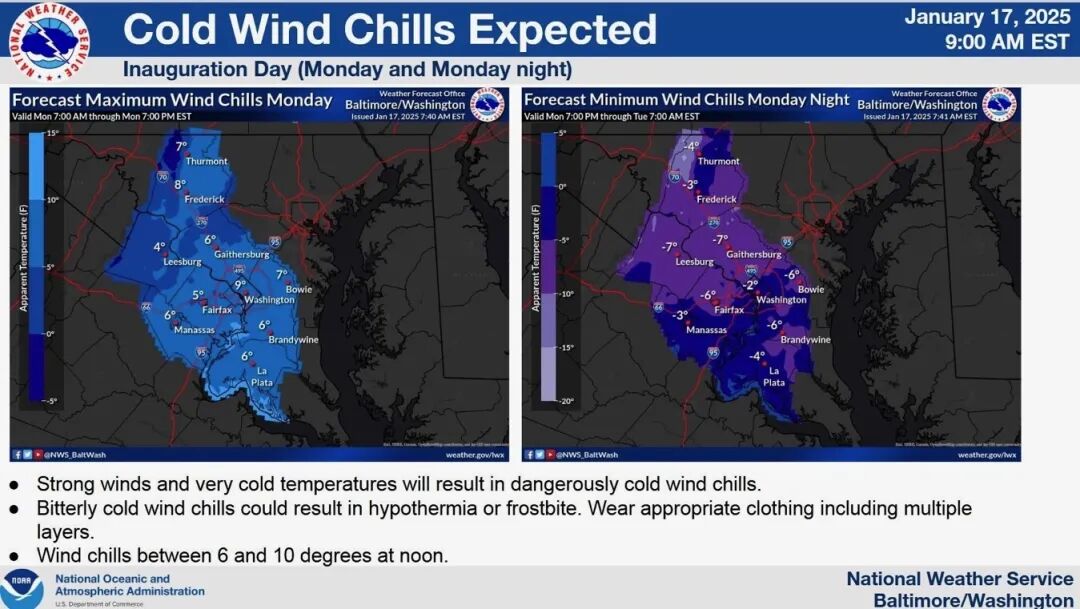 华盛顿最新的天气预报则显示,下周一特朗普宣誓就职时的气温约为19华氏度(零下7摄氏度),但加上风寒效应,预计体感会更冷。