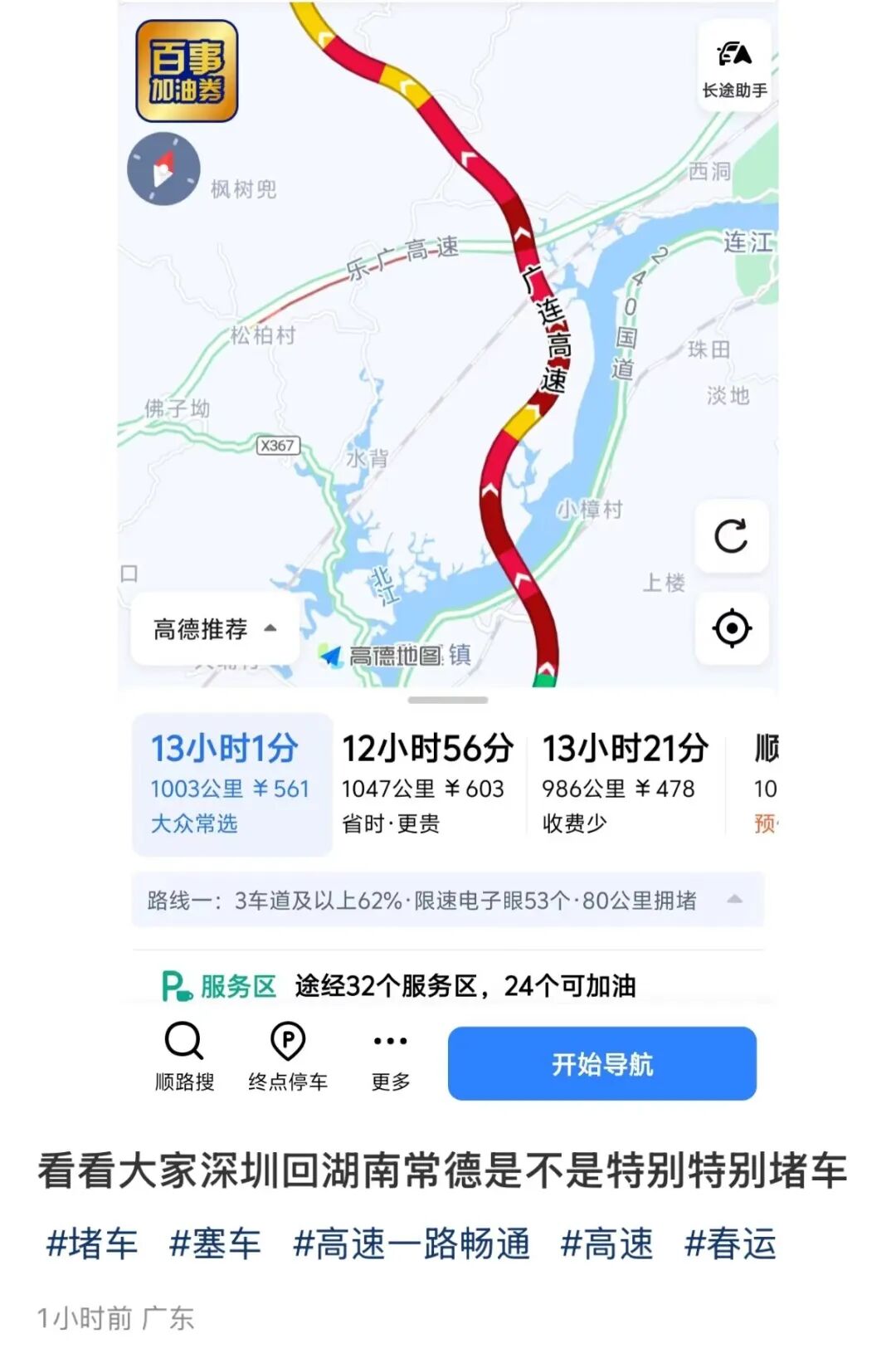 1月20日16时,记者打开导航软件,发现粤北往湖南、江西方向的乐广高速、京港澳高速、大广高速等北向大通道均有不同程度的拥堵。“本想着是提早出发,错峰出行,谁知道大家都是这么想的!”一位广州出发自驾回河南老家的车主说,“提早出发也没用了,还是要多关注实时路况。”