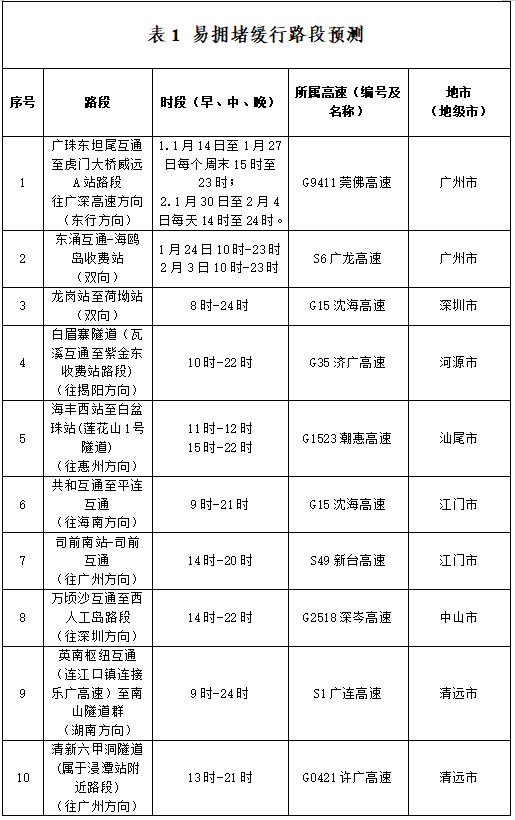 春运期间广东哪些路段易拥堵?