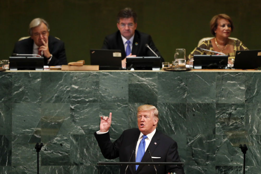 2017年9月19日,在纽约联合国总部,时任美国总统特朗普(前)在联大一般性辩论上发言。新华社记者 李木子 摄