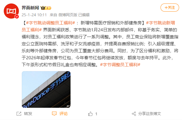 1月24日,界面新闻获悉,字节跳动1月24日发布内部邮件,称基于务实、简单的福利理念,对员工福利政策进行了一系列调整。