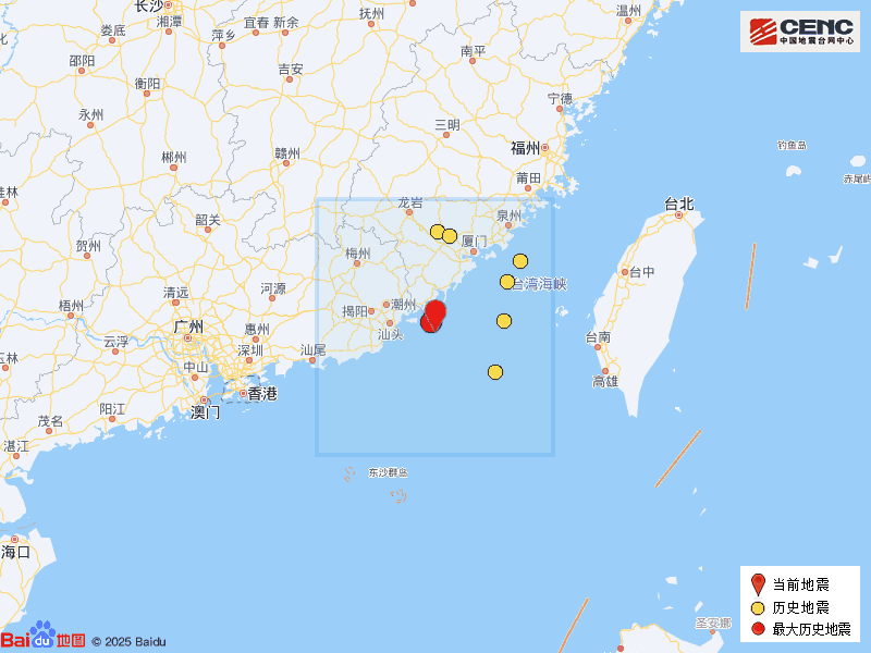历史地震:根据中国地震台网速报目录,震中周边200公里内近5年来发生3级以上地震共8次,最大地震是2023年10月23日在广东汕头市南澳县海域发生的5.0级地震(距离本次震中6公里),历史地震分布如图。