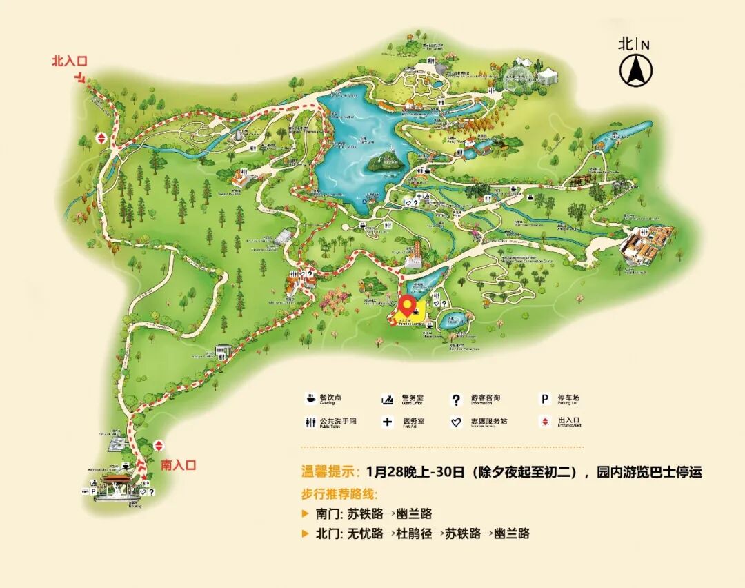 1月28晚上-30日(除夕夜起至初二),仙湖植物园园内所有游览巴士将停止运营,入园进寺游客必须按照人行规划路线活动,路线全程步行约5公里,因排队等候等因素,全程用时约3小时,建议老幼、体弱以及行动不便的人士,尽量避免在春节期间前往仙湖植物园和弘法寺活动。