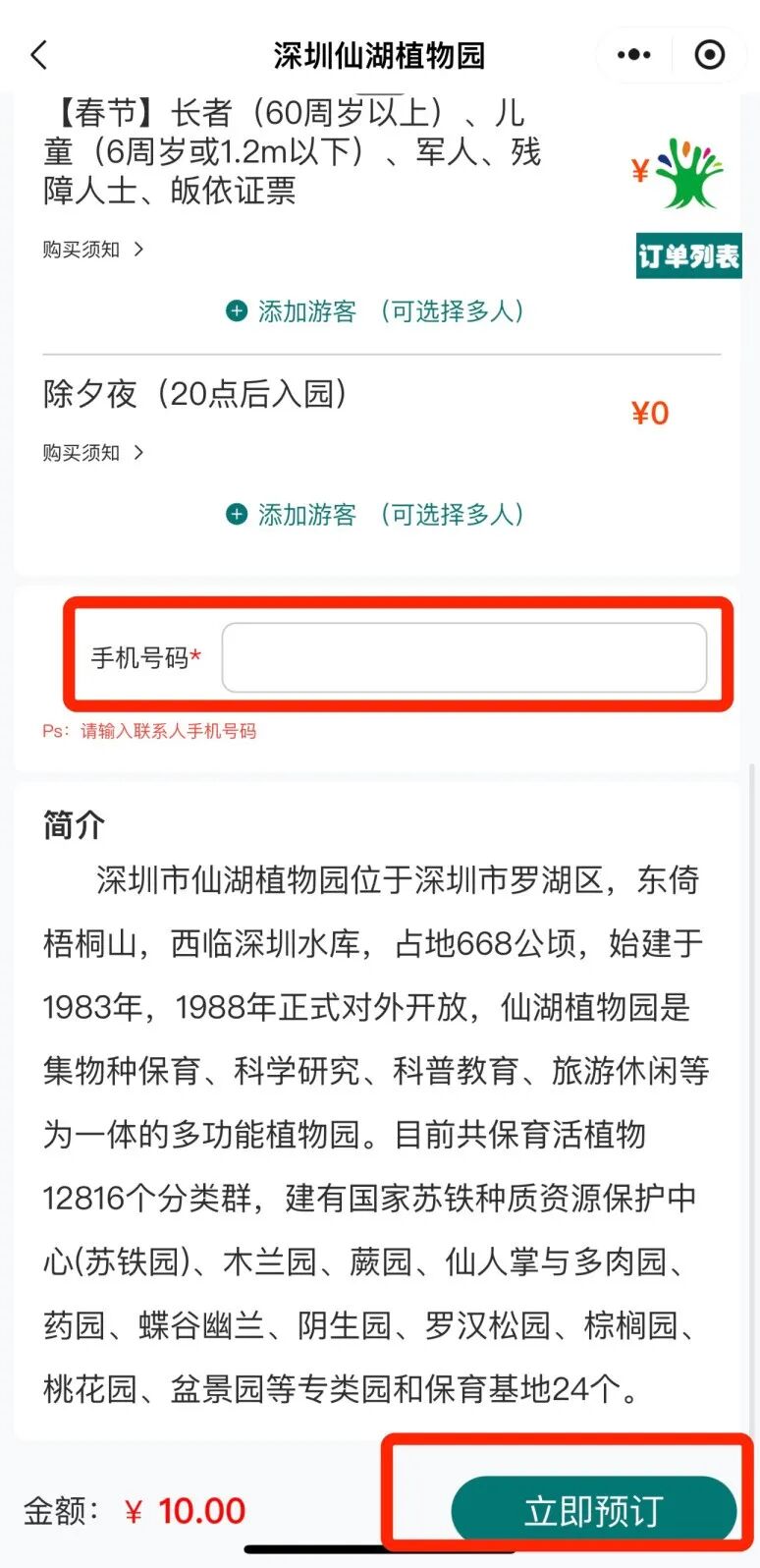 进入“深圳市仙湖植物园”或“美丽深圳”微信公众号购票入口,进入“便民购票”后选择“春节预约”,选择票种,添加入园游客实名制信息并输入手机号,完成支付。门票核验二维码可在“我的订单”中查看。