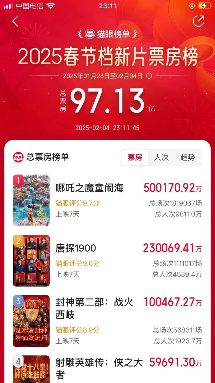 2025年春节档,电影市场迎来前所未有的狂欢——总票房已达97亿元,观影人次刷新历史纪录,爆款影片热度持续走高。