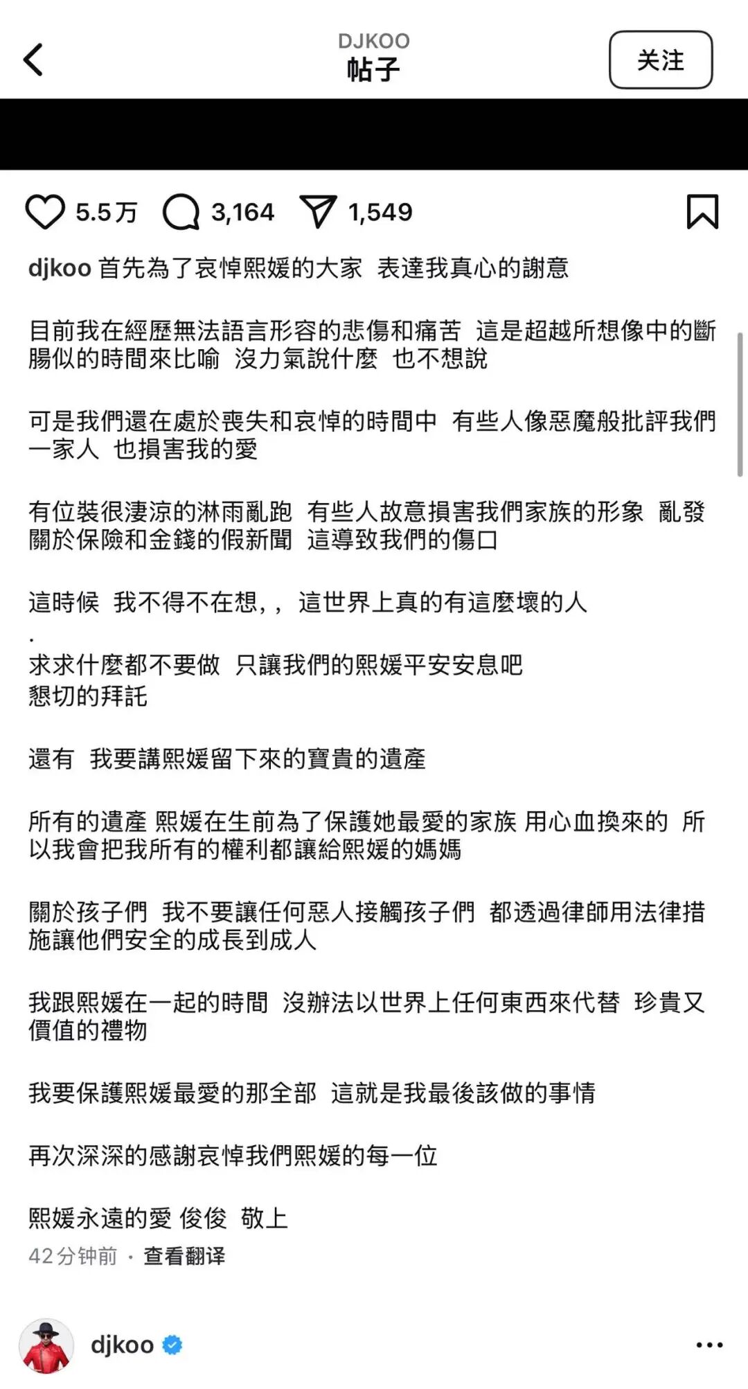 2月6日晚间,大S老公具俊晔打破沉默发文,突然痛失爱妻,他坦言“经历无法语言形容的悲伤和痛苦”,而他的遗产权利将全留给S妈,并承诺“不要让任何恶人接触家人”,字句间充满丧妻之痛,他最后写下“再次深深的感谢哀悼我们熙媛的每一位,熙媛永远的爱 俊俊敬上”。