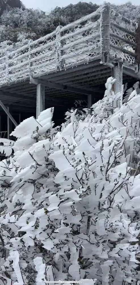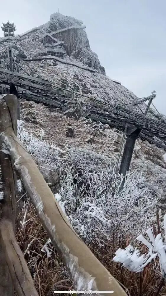 2月8日白天,连山金子山出现雾凇、冰挂现象。图/新浪微博@广东天气