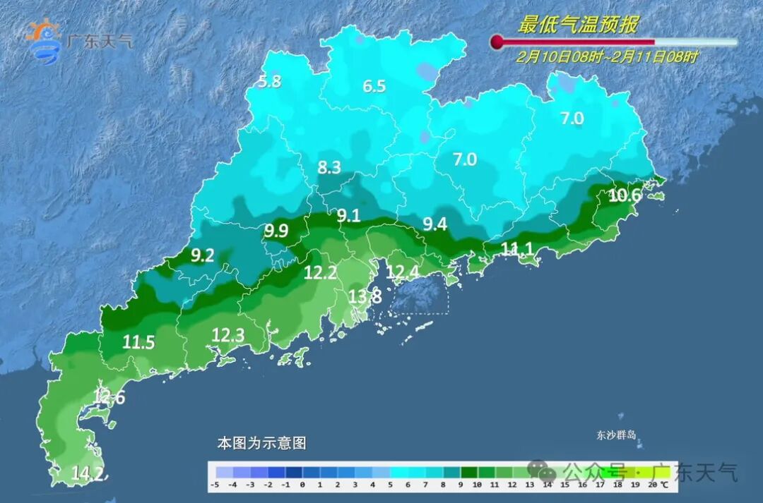 10日,全省大部晴到多云。早晨最低气温:粤北大部市县3~6℃,高海拔山零下1℃~2℃,粤西和珠三角沿海市县9~14℃,其余市县6~9℃。