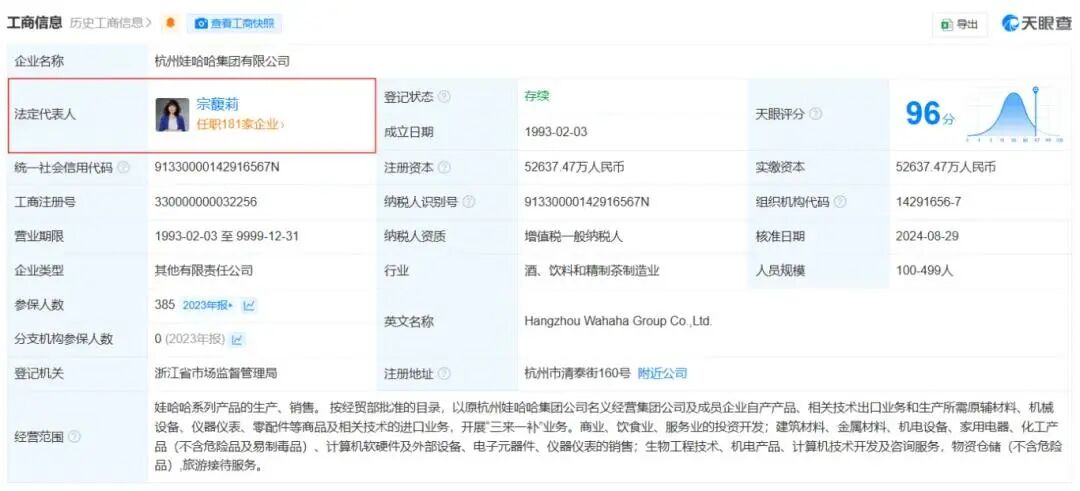 天眼查APP显示,2024年8月29日,杭州娃哈哈集团有限公司发生工商变更,公司法定代表人由宗庆后变更为宗馥莉,同时宗馥莉担任董事长兼总经理职务。