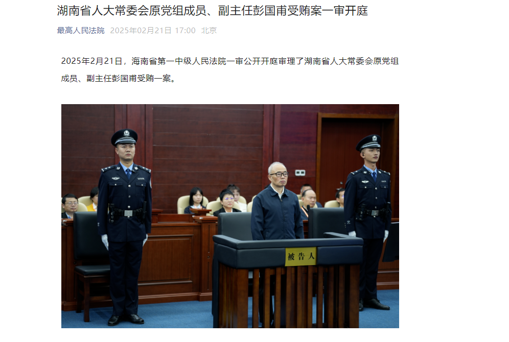 2025年2月21日,海南省第一中级人民法院一审公开开庭审理了湖南省人大常委会原党组成员、副主任彭国甫受贿一案。