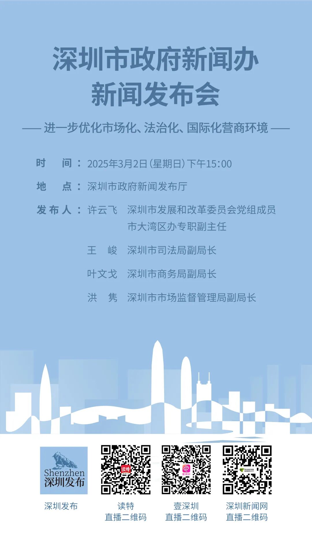 2025年3月2日(星期日)15:00,我市将举行新闻发布会,市发展改革委(市大湾区办)、市司法局、市商务局、市市场监管局有关负责人出席,介绍深圳市进一步优化市场化、法治化、国际化营商环境相关情况,并回答记者提问,敬请关注。