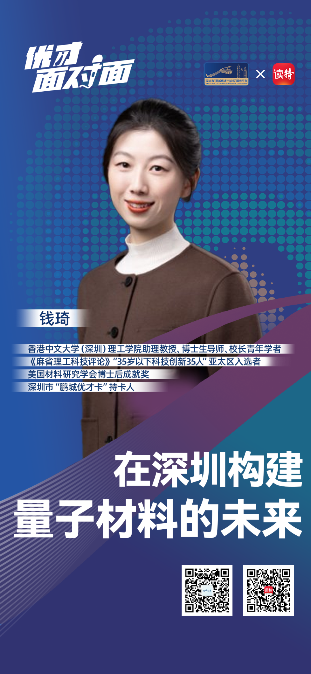 本期优才面对面,邀请到《麻省理工科技评论》“35岁以下科技创新35人”亚太区入选者、香港中文大学(深圳)理工学院助理教授、博士生导师、美国材料研究学会博士后成就奖、深圳市“鹏城优才卡”持卡人钱琦讲述她的科研故事。