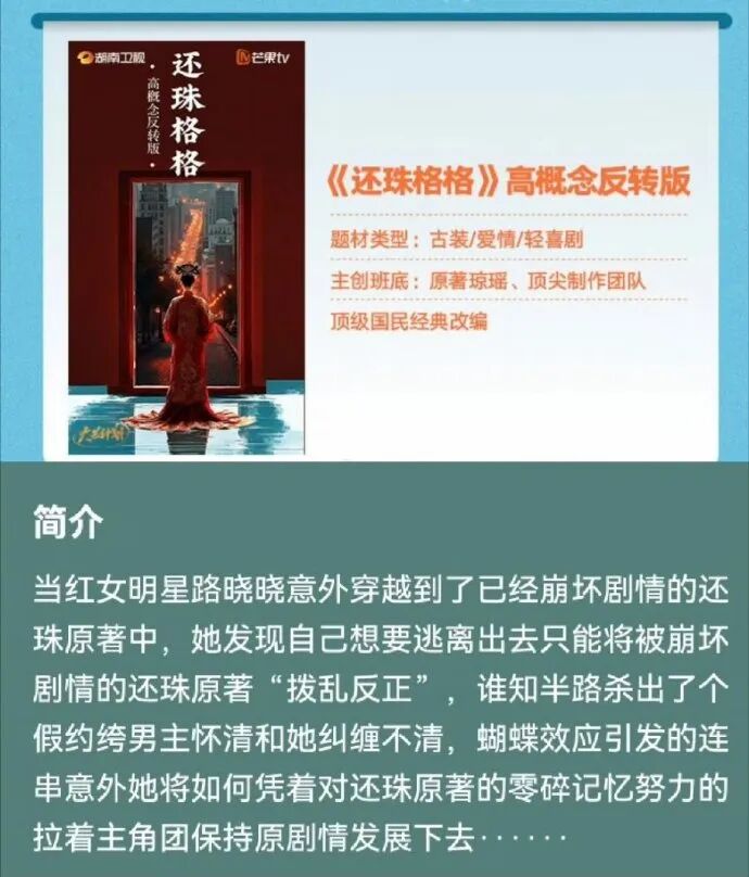 短剧《还珠》改编自琼瑶的同名小说《还珠格格》,大致剧情是当红女明星意外穿越到了已经崩坏剧情的还珠原著中所发生的故事。制作方希望通过短剧的形式试水市场,测试观众的反应,以便未来决定是否进一步推出长剧。网上曝光的招商资料显示“女明星穿书丫鬟金锁,最强NPC自我觉醒”。
