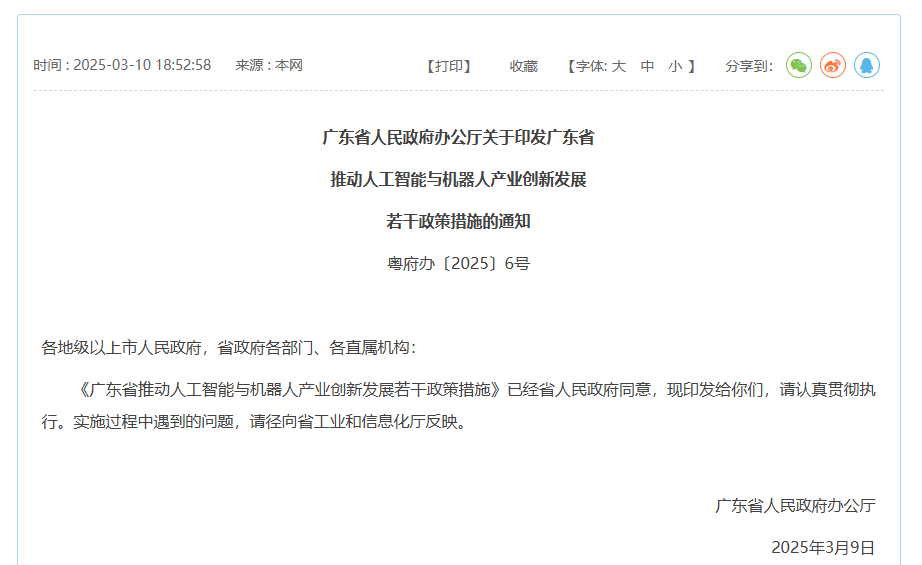 3月10日,记者从广东省人民政府官网获悉,广东省人民政府办公厅印发广东省推动人工智能与机器人产业创新发展若干政策措施的通知,其中提出了支持关键核心技术攻关、培育优质企业、打造应用场景等12项政策措施。具体内容如下: