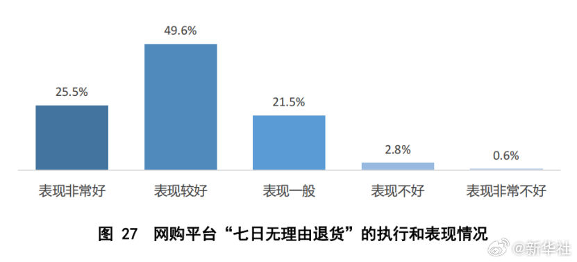 “3·15”前夕,中国消费者协会发布“共筑满意消费”2025年消费维权年主题调查报告。调查结果显示,消费者对网购平台及商家“七日无理由退货”政策整体执行评价较好。认为目前网购平台的七日无理由退货服务“表现非常好”和“表现较好”的受访者分别占比25.5%、49.6%,说明该项服务受到多数消费者的普遍认可。