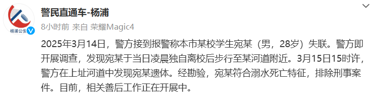 3月15日,针对“复旦博士失联”一事,上海警方发布情况通报。通报称,3月15日15时许,警方在上址河道中发现宛某遗体。