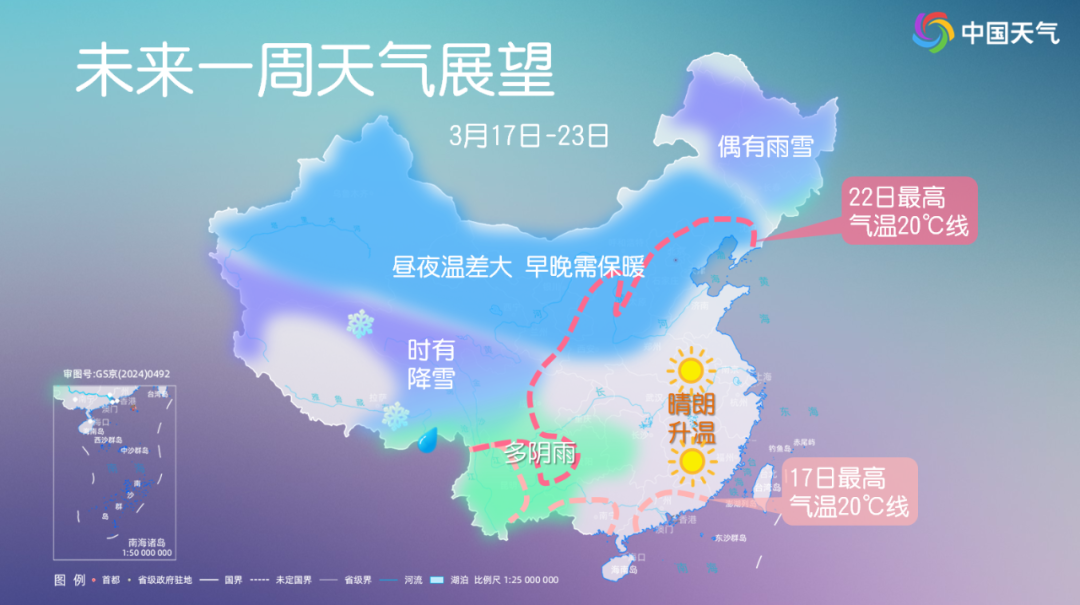 预计今后7天(3月17日至23日),西北地区以及中东部大部最高气温累计升温幅度将超过10℃,特别是长江以北地区将普遍超过15℃,其中内蒙古东部、河北北部、辽宁西部部分地区升幅甚至可达20℃以上。多地气温将从冷如常年2月,一键切换到暖如常年5月,又是一次“换季式”体验。