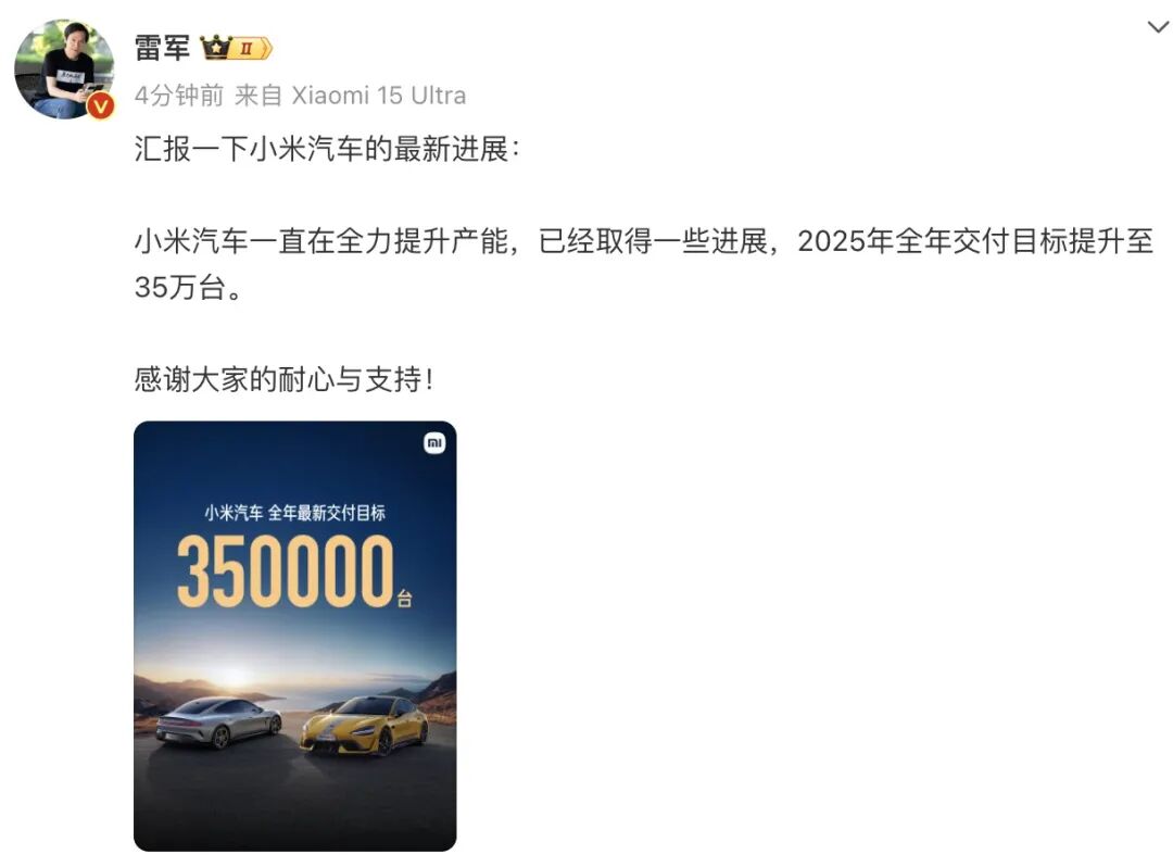 “小米汽车一直在全力提升产能,已经取得一些进展,2025年全年交付目标提升至35万台。感谢大家的耐心与支持!”