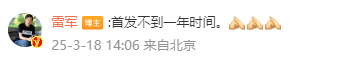 雷军还在评论区留言“首发不到一年”。据悉,小米SU7是小米集团造车后发布的首款车型,于2024年3月28日发布。