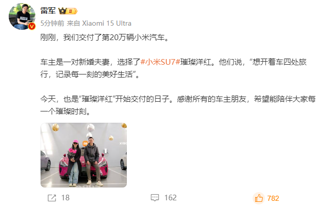 18日早些时候,雷军发文称:“刚刚,我们交付了第20万辆小米汽车。车主是一对新婚夫妻,选择了小米SU7璀璨洋红。他们说‘想开着车四处旅行,记录每一刻的美好生活’。”