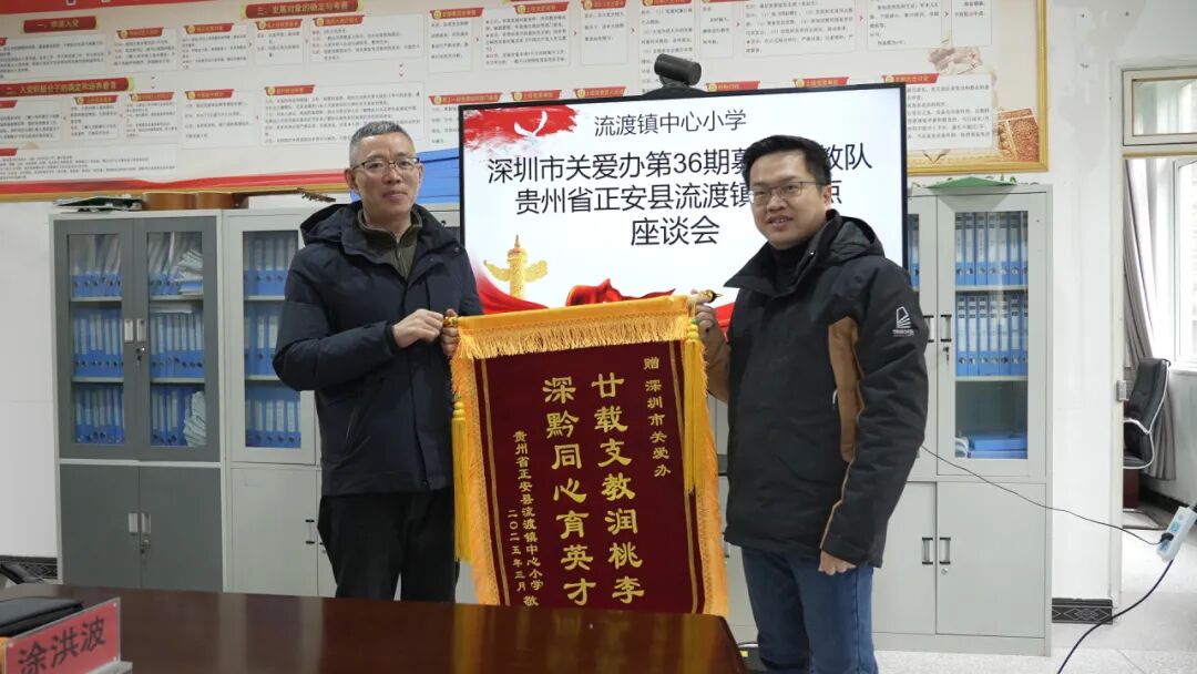 最后,正安县教育体育局局长王胤向深圳市关爱办赠送“廿载支教润桃李,深黔同心育英才”锦旗,表达对深圳关爱行动无私援助的诚挚感谢。他表示,通过募师支教这种方式,能让孩子们在家门口就能上好学,能享受优质教育资源,一定程度缓解了乡村教育资源不足的问题。相信在社会各界的关心关怀下,乡村的教育事业一定会越来越好。
