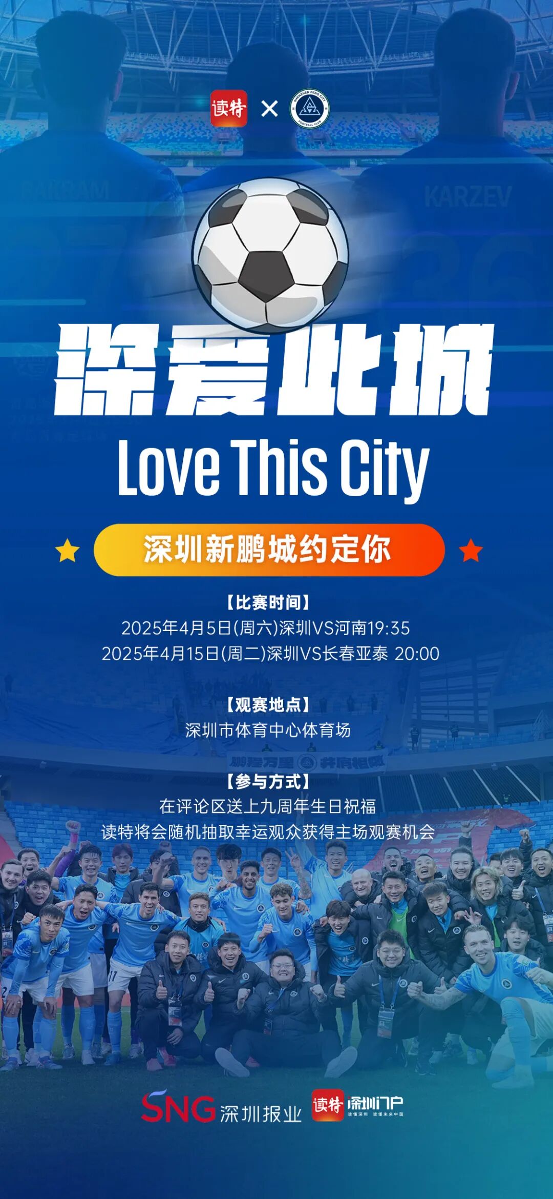 与此同时,2025中超联赛深圳新鹏城的主场首战对阵云南玉昆的比赛也将在今晚举行。这一次,读宝联手深圳新鹏城俱乐部为【读特用户】随机送出两场主场比赛门票。
