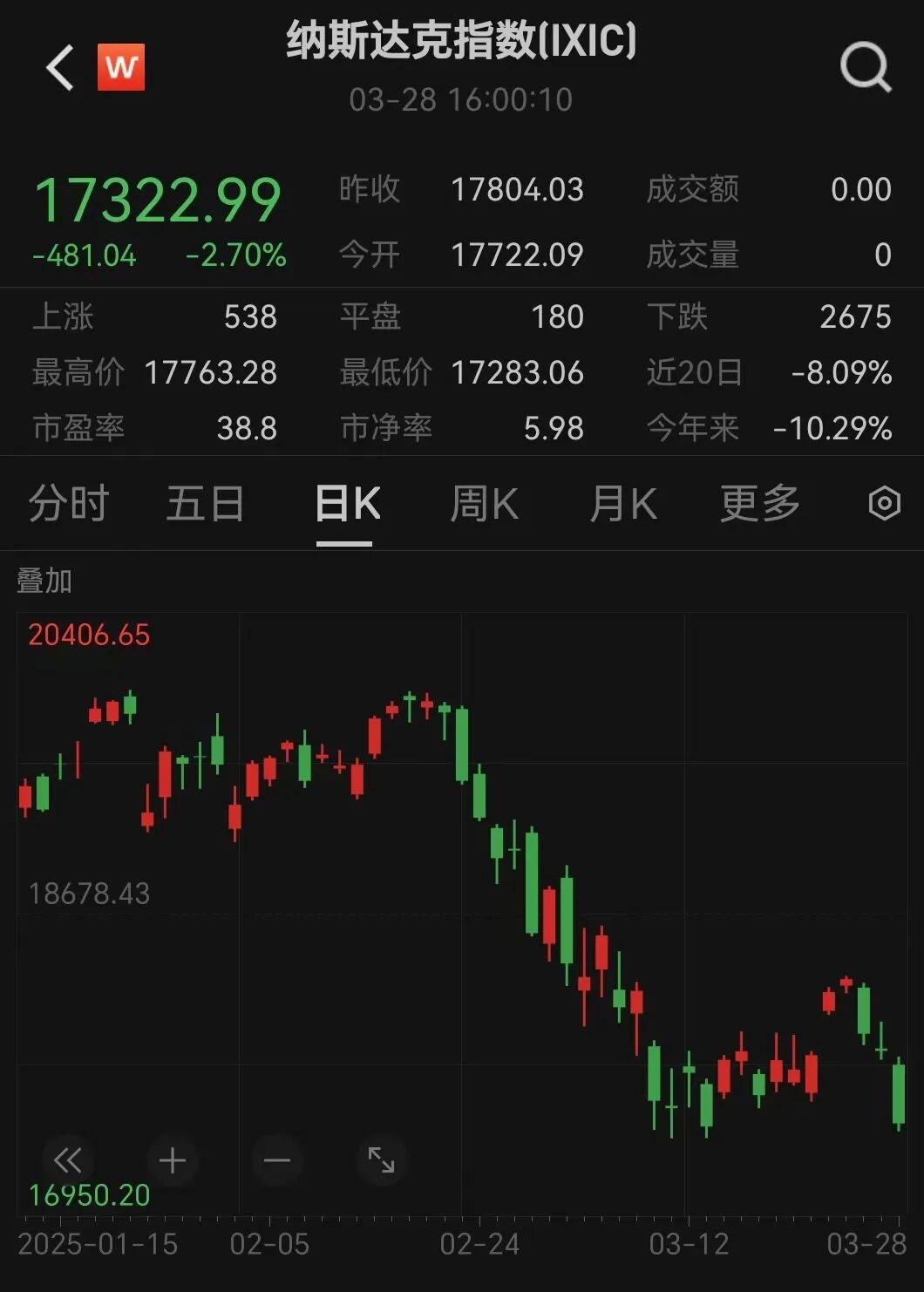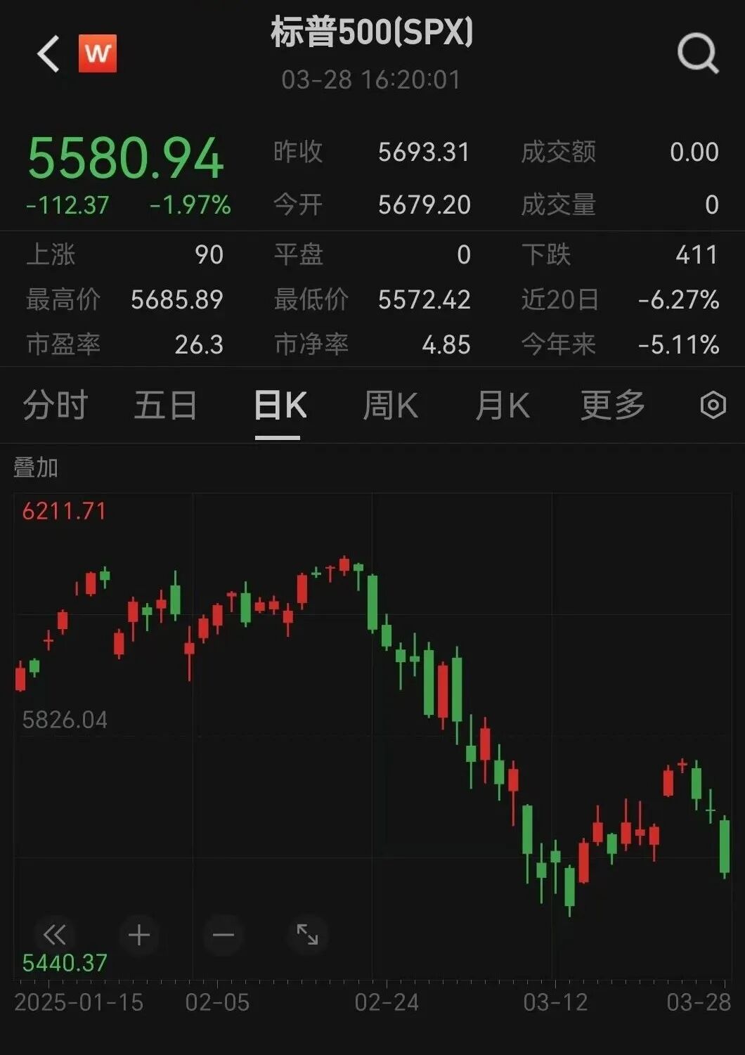 截至3月28日收盘,道指跌超700点,跌幅达1.69%,报41583.9点;标普500指数跌1.97%,报5580.94点;纳指跌2.7%,报17322.99点。