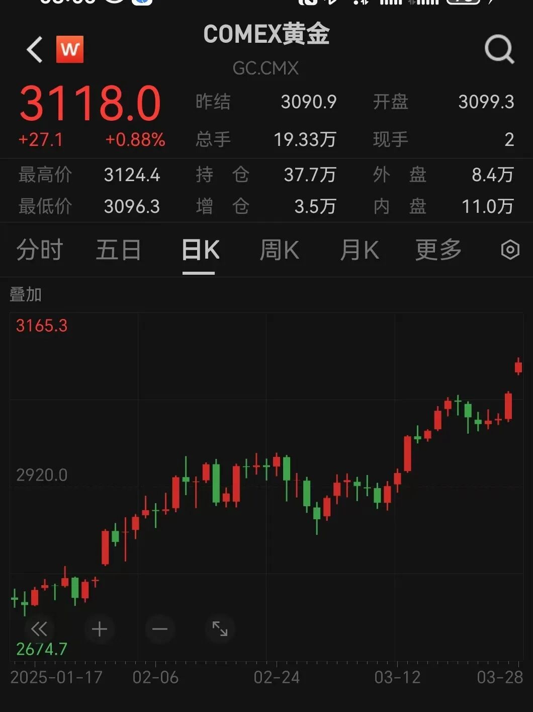 伦敦现货黄金涨0.94%,报3084.33美元/盎司;COMEX黄金期货6月合约涨0.88%,报3118美元,本周累涨2.26%。均继续创出历史新高。