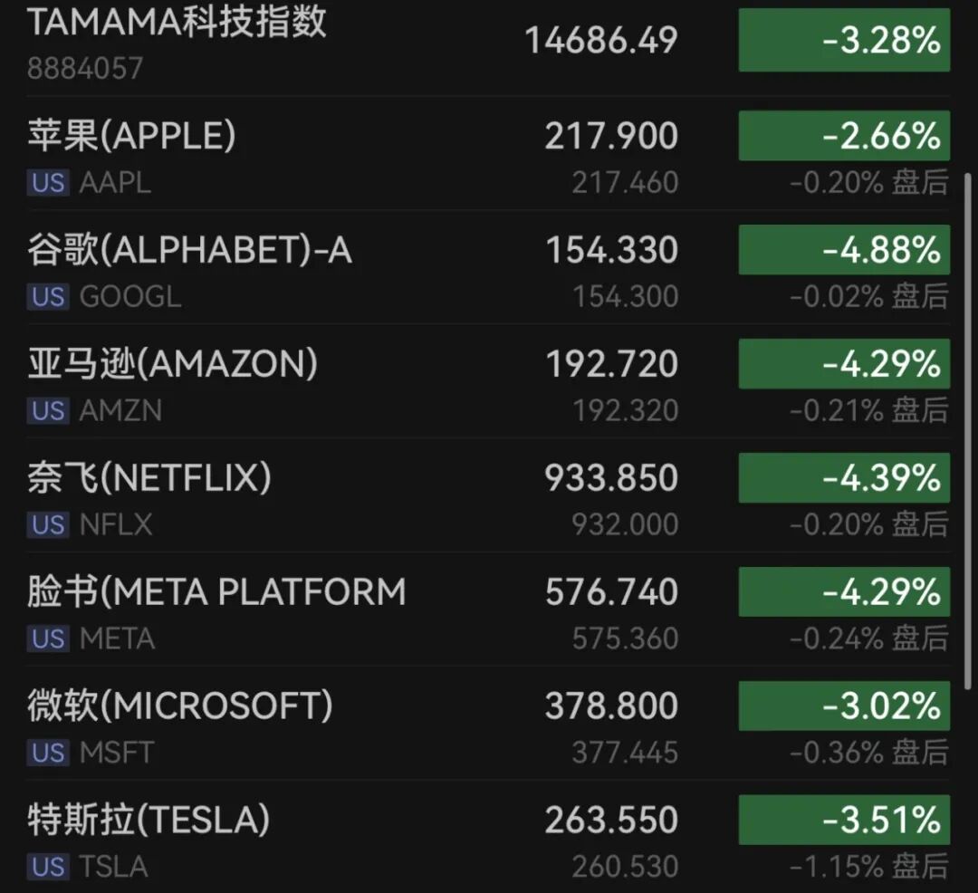 大型科技股全线下跌,TAMAMA科技指数跌3.28%。谷歌跌近5%,亚马逊跌逾4%,脸书跌超4%,特斯拉跌逾3%,微软跌超3%,苹果跌逾2%。