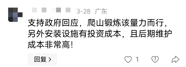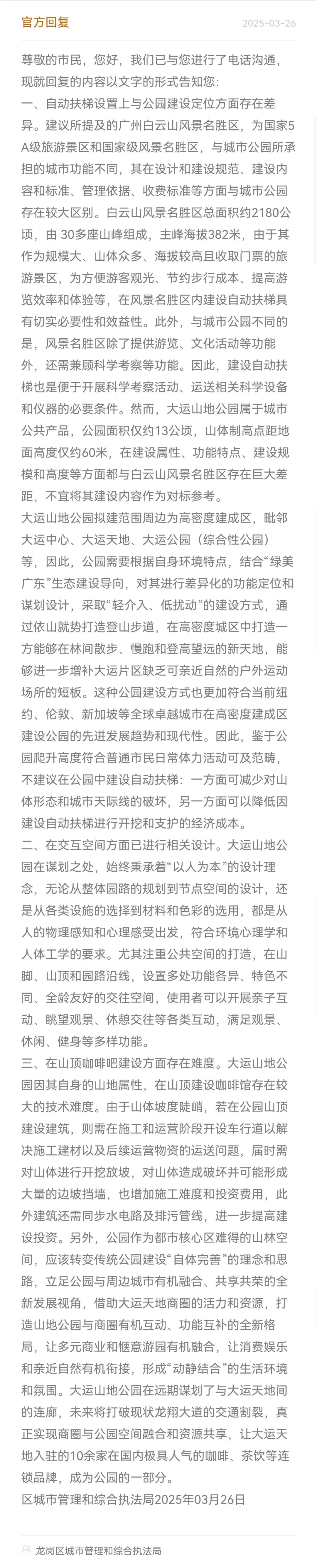 关于设置自动扶梯的问题,回复中指出,自动扶梯设置上与公园建设定位方面存在差异。建议所提及的广州白云山风景名胜区,为国家5A级旅游景区和国家级风景名胜区,与城市公园所承担的城市功能不同,其在设计和建设规范、建设内容和标准、管理依据、收费标准等方面与城市公园存在较大区别。白云山风景名胜区总面积约2180公顷,由30多座山峰组成,主峰海拔382米,由于其作为规模大、山体众多、海拔较高且收取门票的旅游景区,为方便游客观光、节约步行成本、提高游览效率和体验等,在风景名胜区内建设自动扶梯具有切实必要性和效益性。