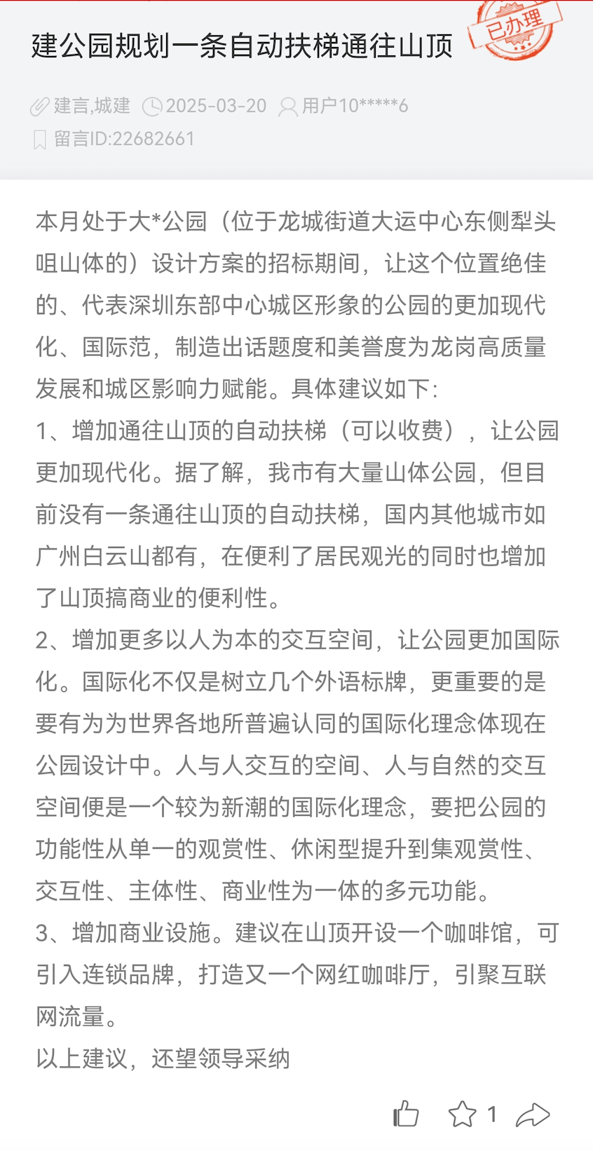 该市民表示,3月处于大运山地公园建设工程设计方案的招标期间,本着让此公园为龙岗区高质量发展和城区影响力赋能的初衷,给到以下具体建议。